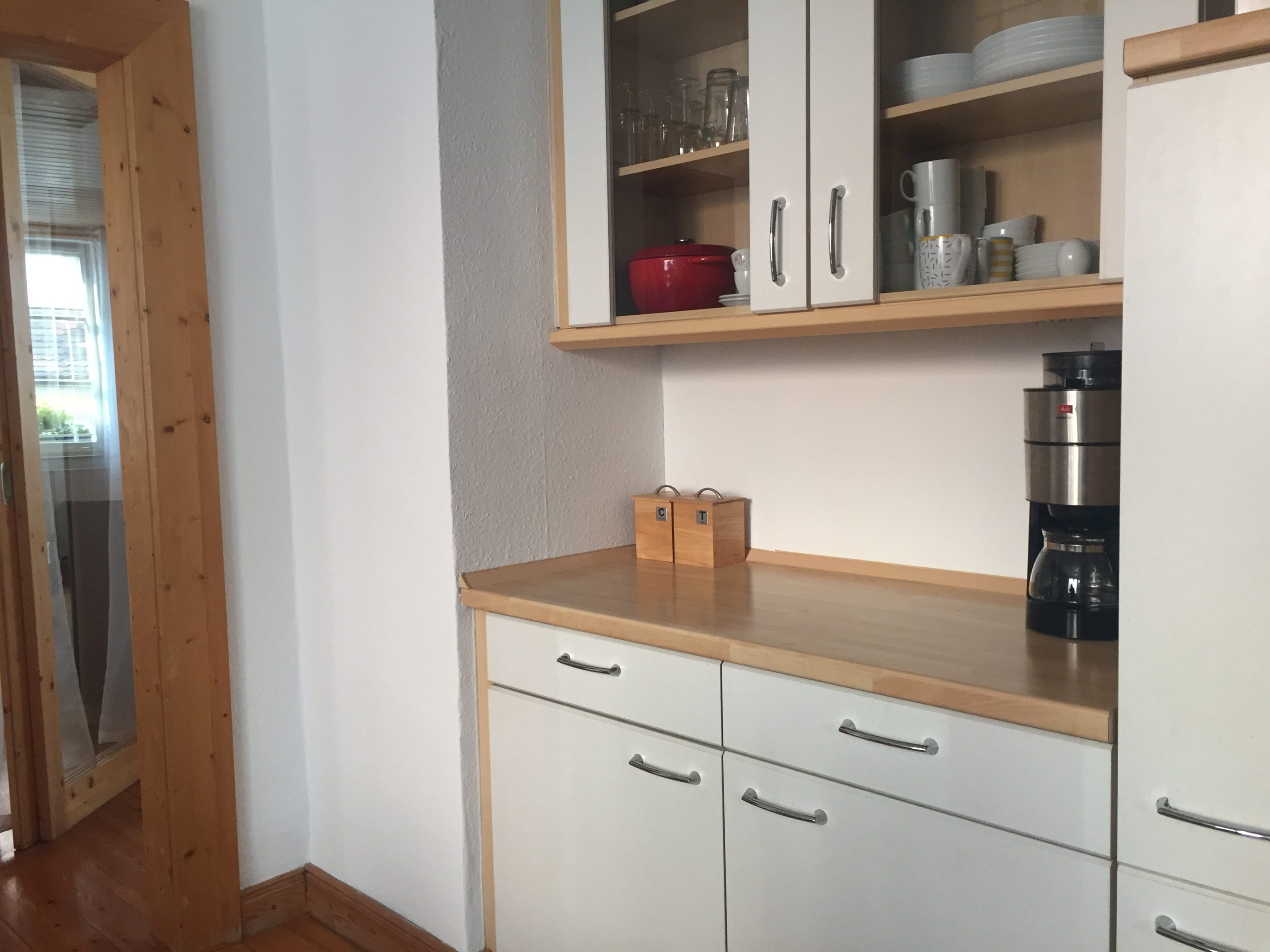 Einbauküche mit Spülmaschine, Kühlschrank, Frostfach, Backofen, Mikrowelle, Kaffeemaschine, Espressomaker, Toaster, Wasserkocher, Eierkocher, Töpfe und Geschirr, Tisch- und Küchenwäsche ausreichend vorhanden.