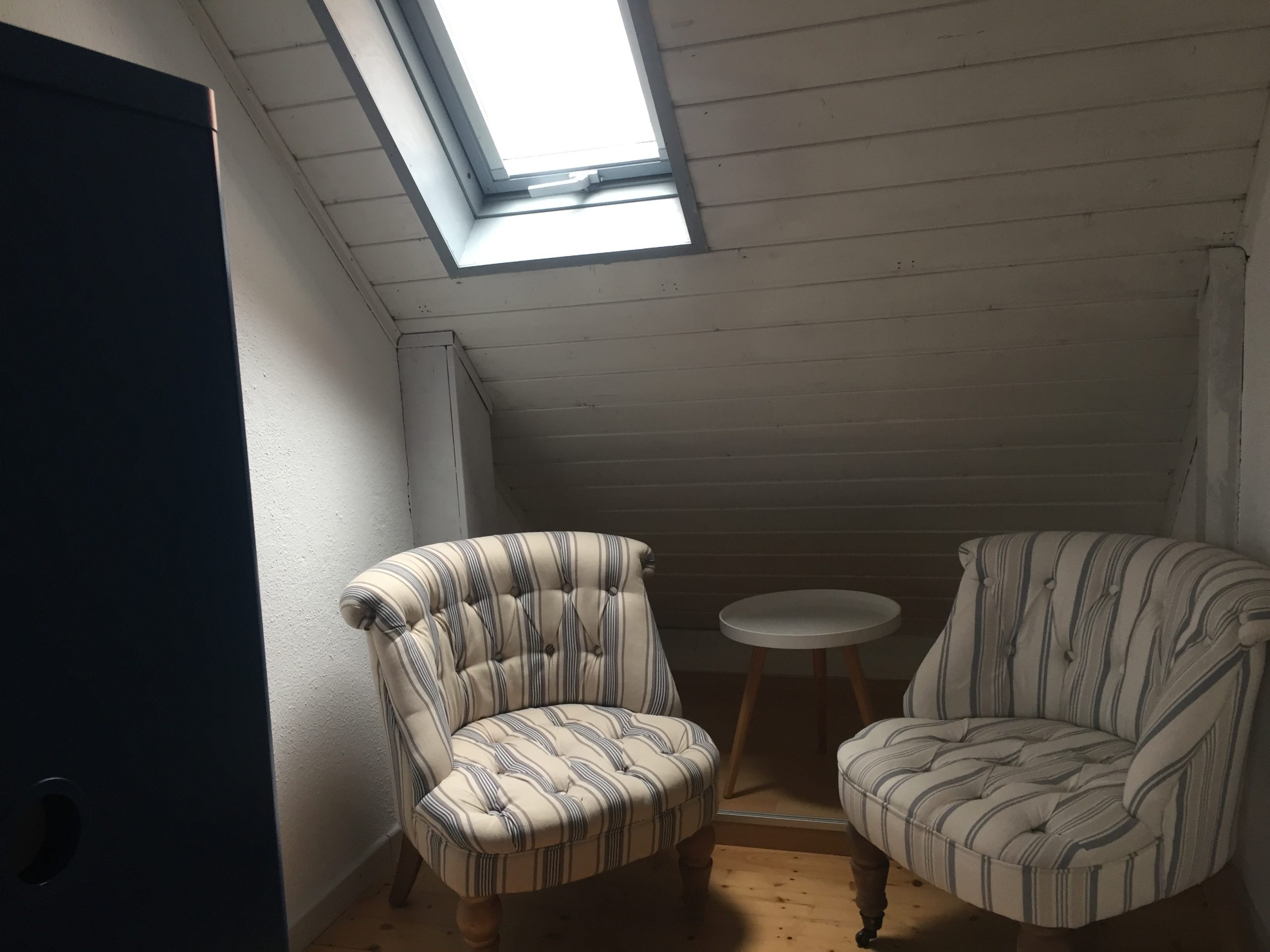 Im Zwerchgiebel des historischen Stadthauses (55 qm in der zweiten Etage öffnet sich eine romantische und moderne Wohnung über den Dächern der Altstadt, Der steilere Treppenaufgang wird mit mit einem romantischen, hellen Wohnzimmer belohnt, sanierter Dielenboden, mit (Schlaf)-Couch, Sessel, TV (Kabel), kostenfreies W-LAN für die Internetnutzung, Stereo-Anlage, Bücher aus unserer Gästebibliothek.