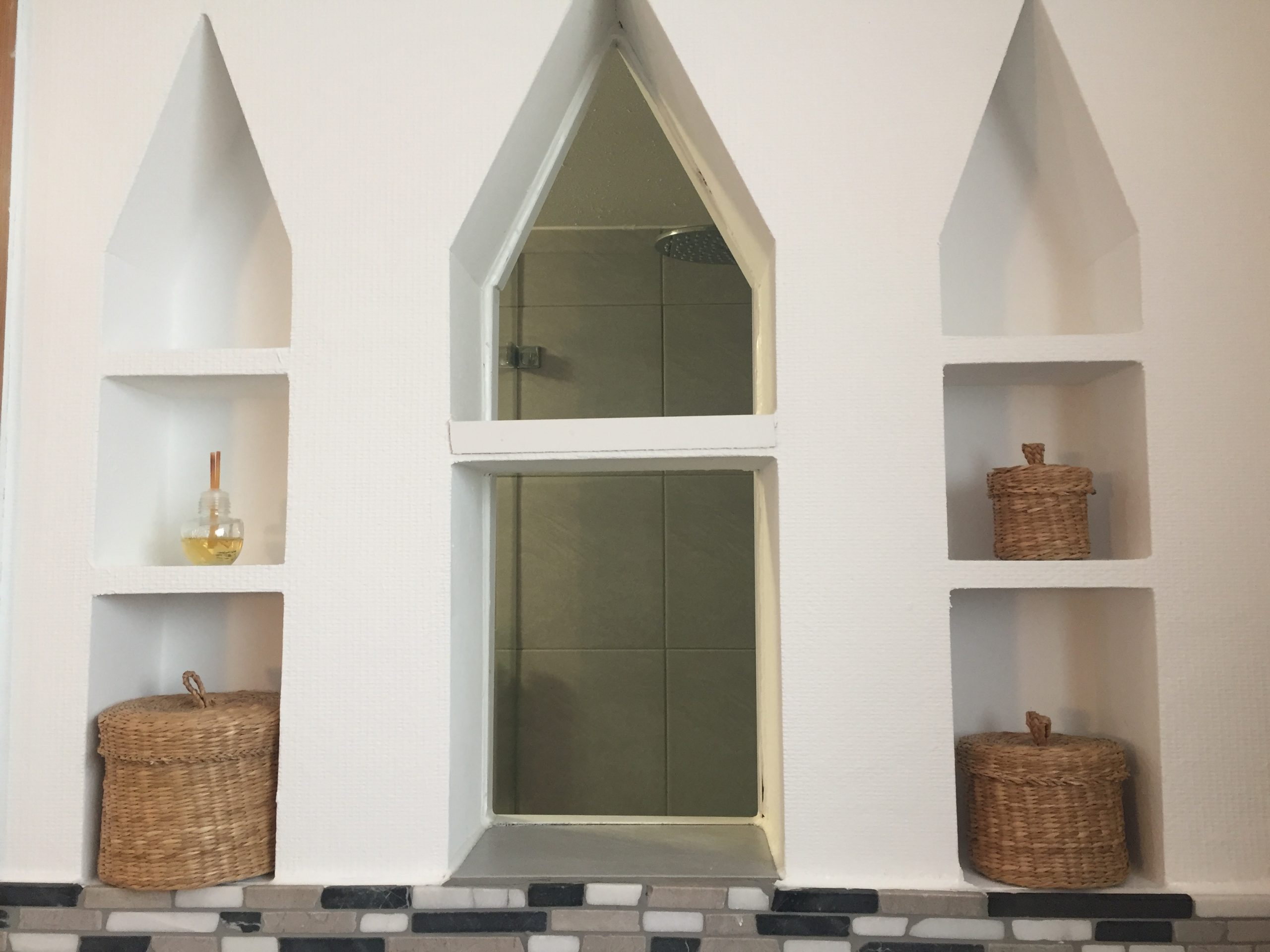 Großes (Turm)-Bad mit Wanne, Dusche, Handtuchtrockner, Bade- und Handtücher, leihweise Bademäntel, Badeutensilien, Fön, Waschmaschine.