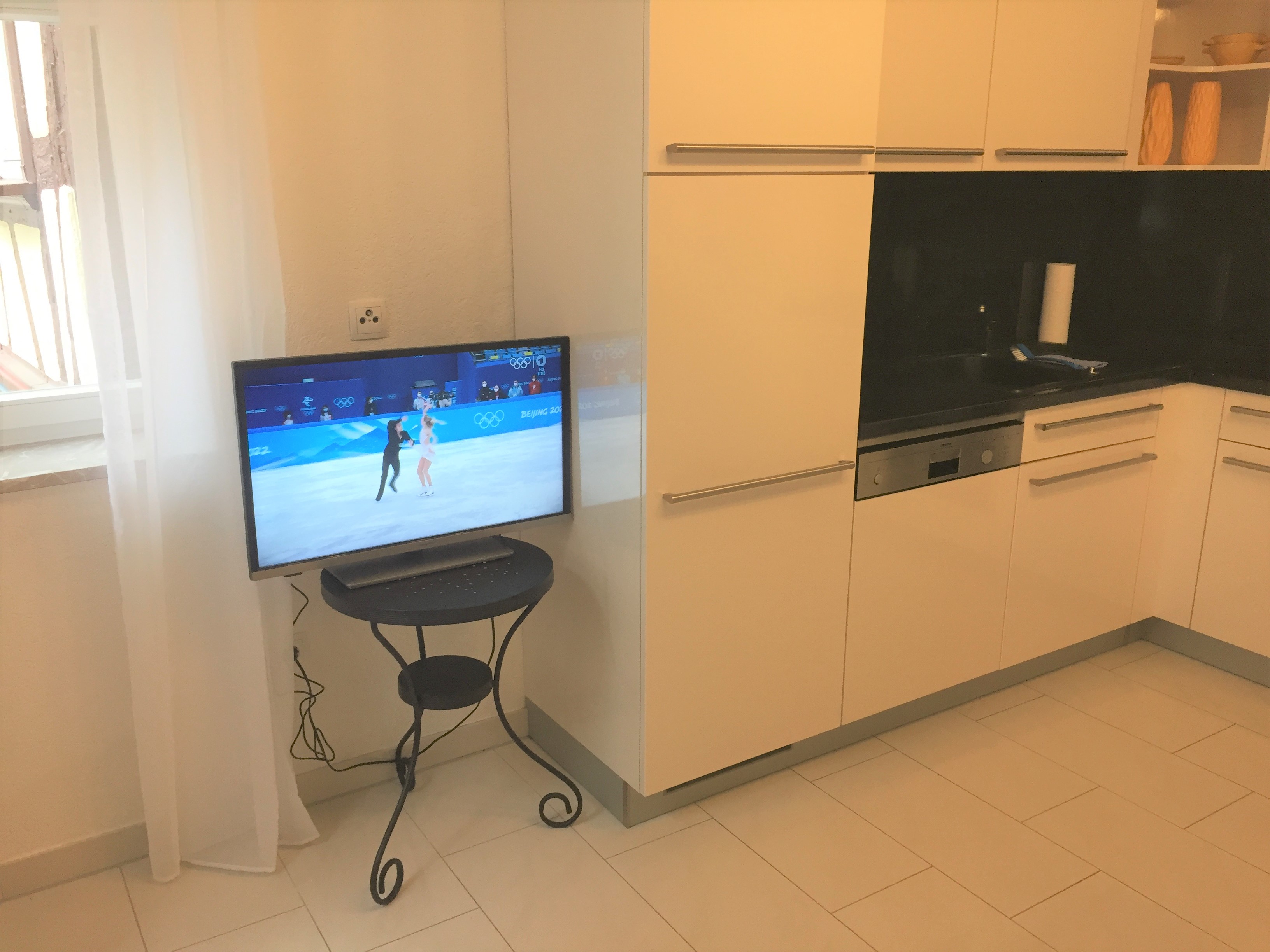 Diese neu angebotene Ferienwohnung (89 qm) befindet sich in der ersten Etage des historischen Denkmals, Hauptstraße 60 in der Fußgängerzone. Im hellen, großzügigen Wohn-Esszimmer gibt es eine Eckcouch mit Schlaffunktion, Sessel und Ablagetische sowie einen Magenta-TV mit allem Fernsehkomfort, eine Stereoanlage mit BlueRay und Bluetooth, der Essbereich weist einen großen Esstisch mit vier Design Sitzmöbeln auf. Hier befindet sich auch der Schreibtisch.