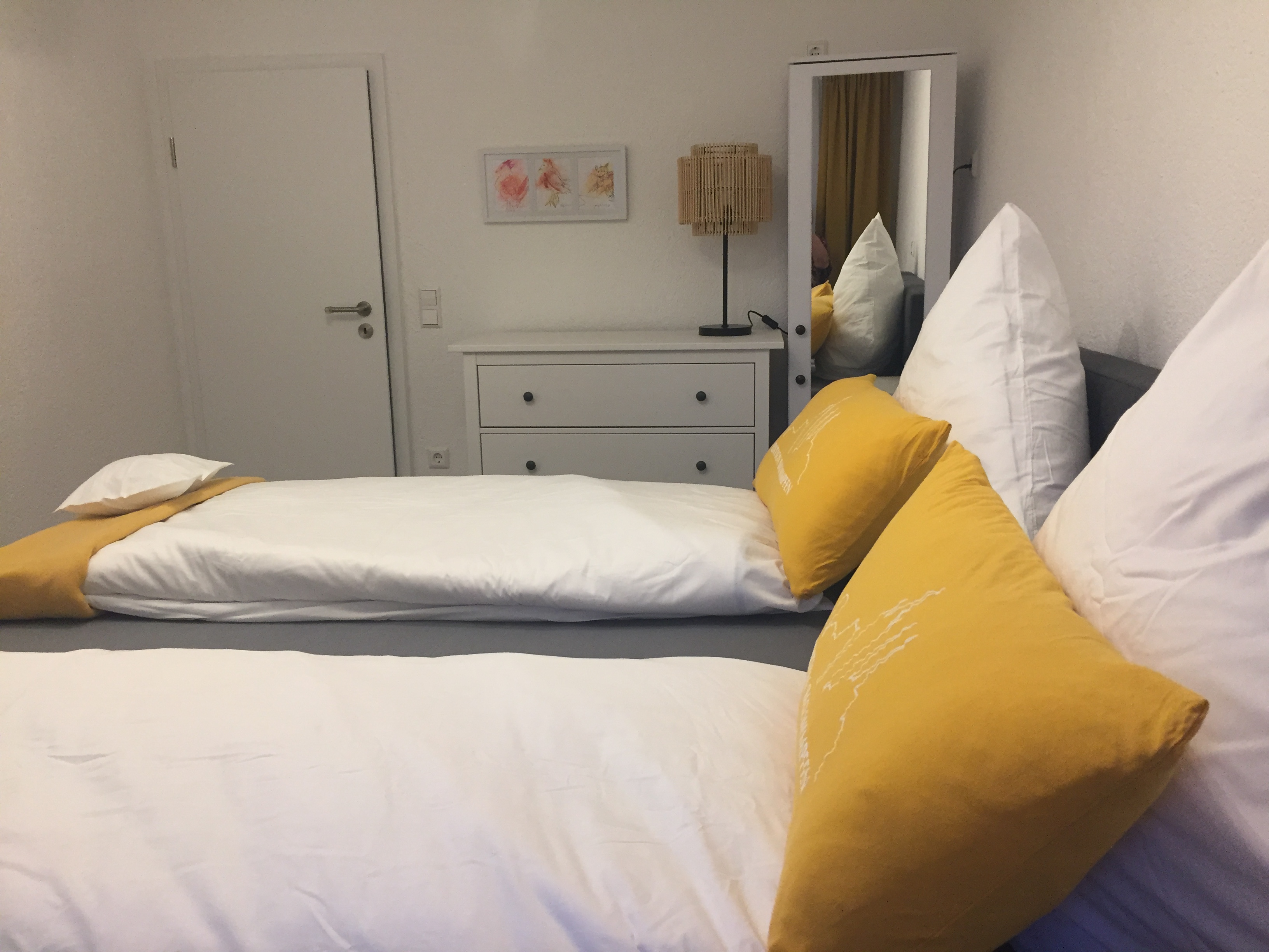 Der Schlafraum ist mit zwei breiten Boxspringbetten (jeweils 1 x 2 m) ausgestattet, die auch getrennt gestellt werden können. Darüberhinaus findet alles im Kleiderschrank und in der Kommode Platz.